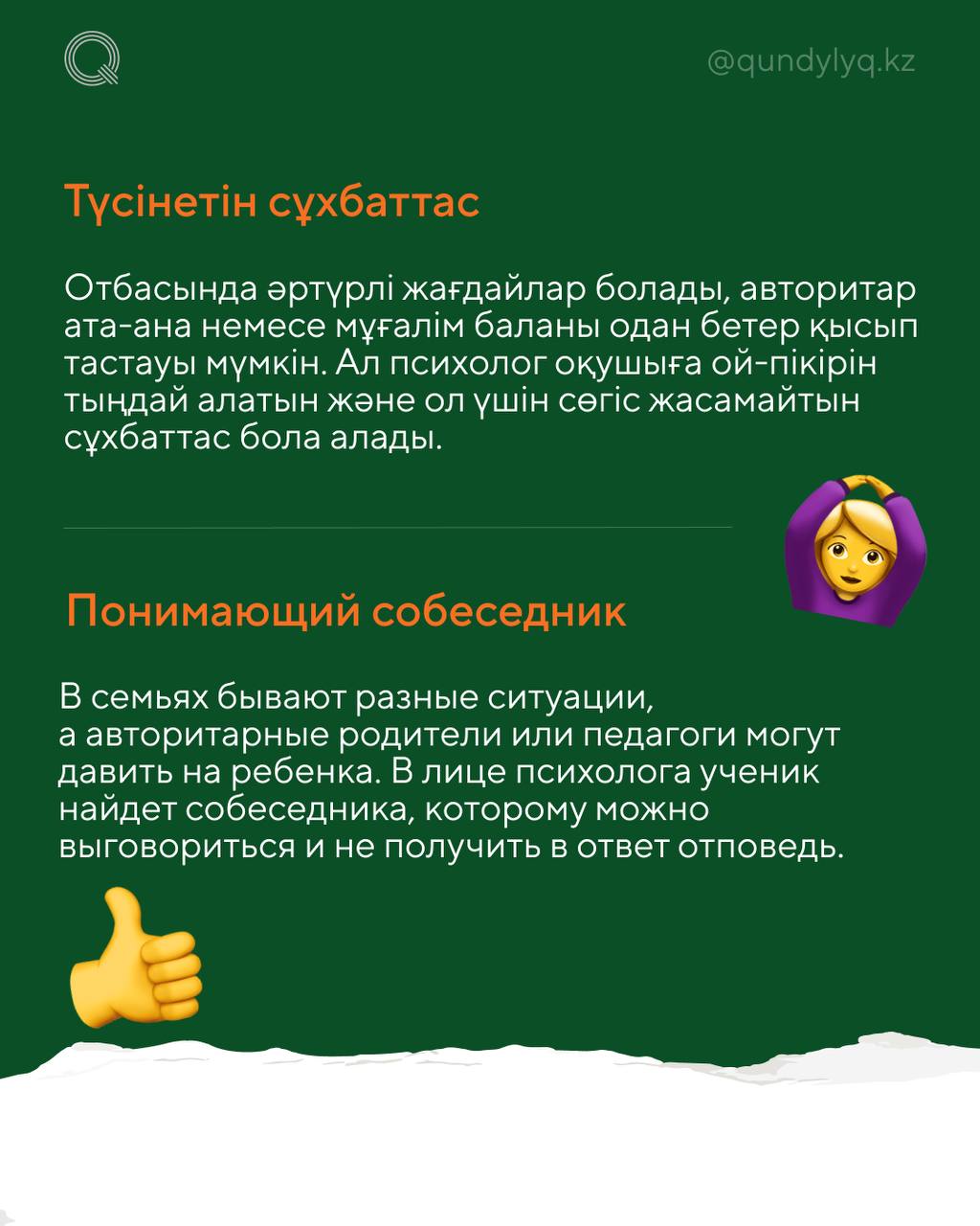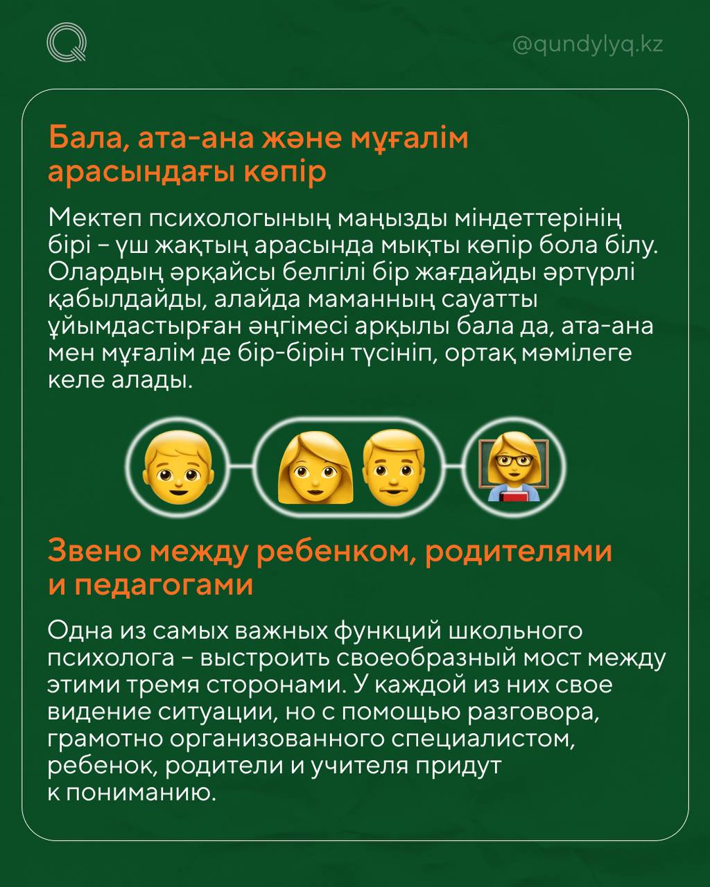Алайда көзқарас толықтай оң бағытқа өзгерді деуге әлі ерте. Бүгінгі постта біз мектепке психолог не үшін қажет екеніне тоқталып, оның алдымен балаға, сонымен қатар ата-аналар мен мұғалімдерге қалай көмектесе алатыны жайлы айтпақпыз.